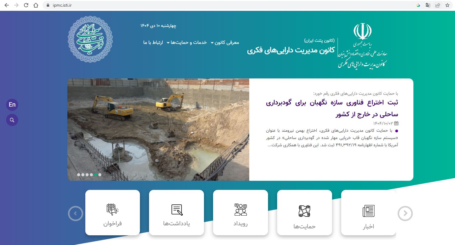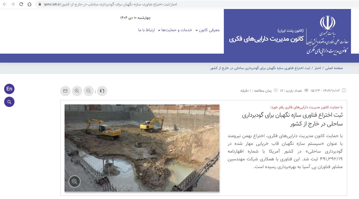 با حمایت کانون مدیریت داراییهای فکری، اختراع جناب آقای دکتر بهمن نیرومند با عنوان «سیستم سازه نگهبان قاب خرپایی مهار شده در گودبرداری ساحلی» در کشور آمریکا با شماره اظهارنامه 491,392/19 ثبت شد. این فناوری با همکاری شرکت مهندسین مشاور فناوران پی آسیا به بهرهبرداری رسیده است.